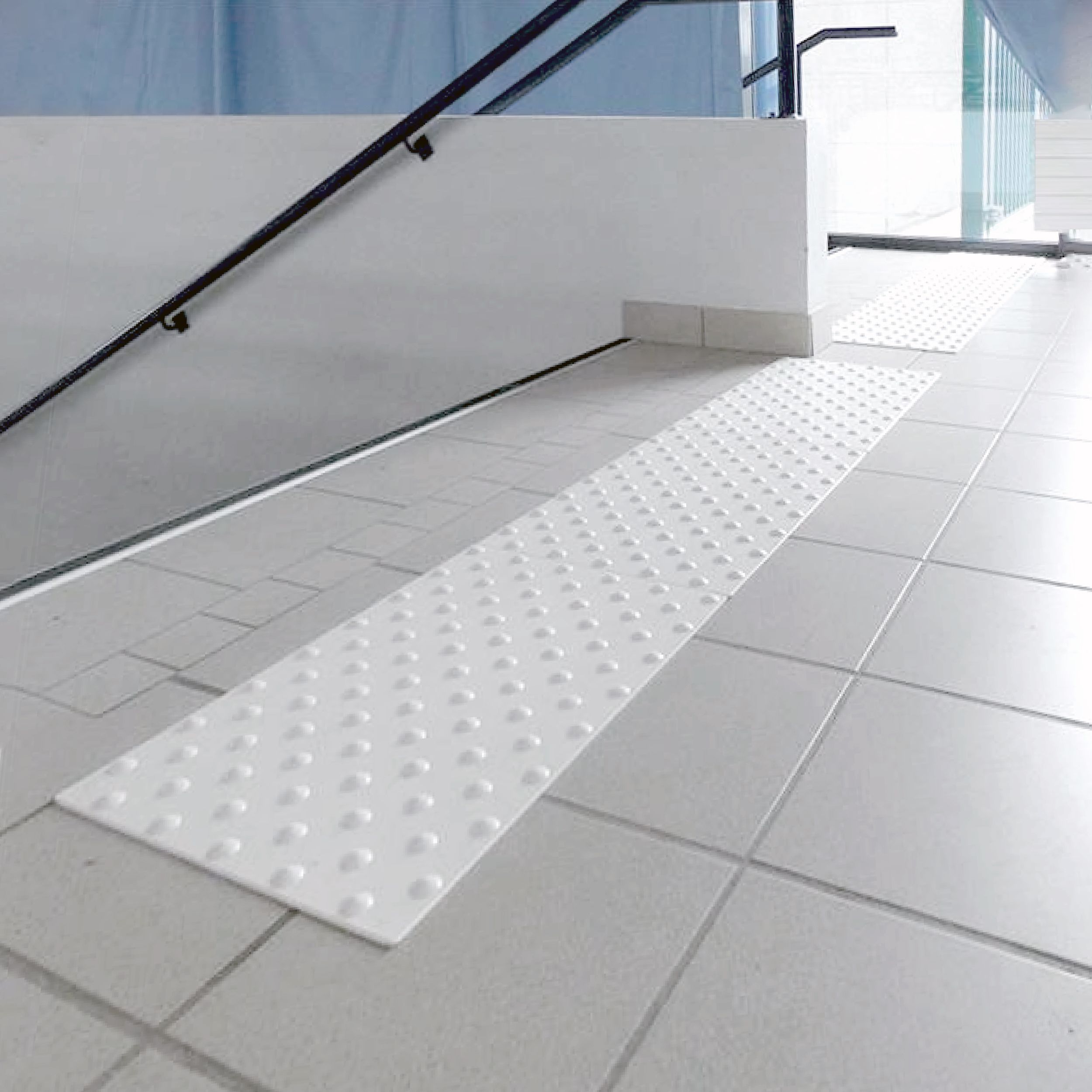 Bande podotactile pour escalier, munie d’un adhésif pour une pose rapide et facile.